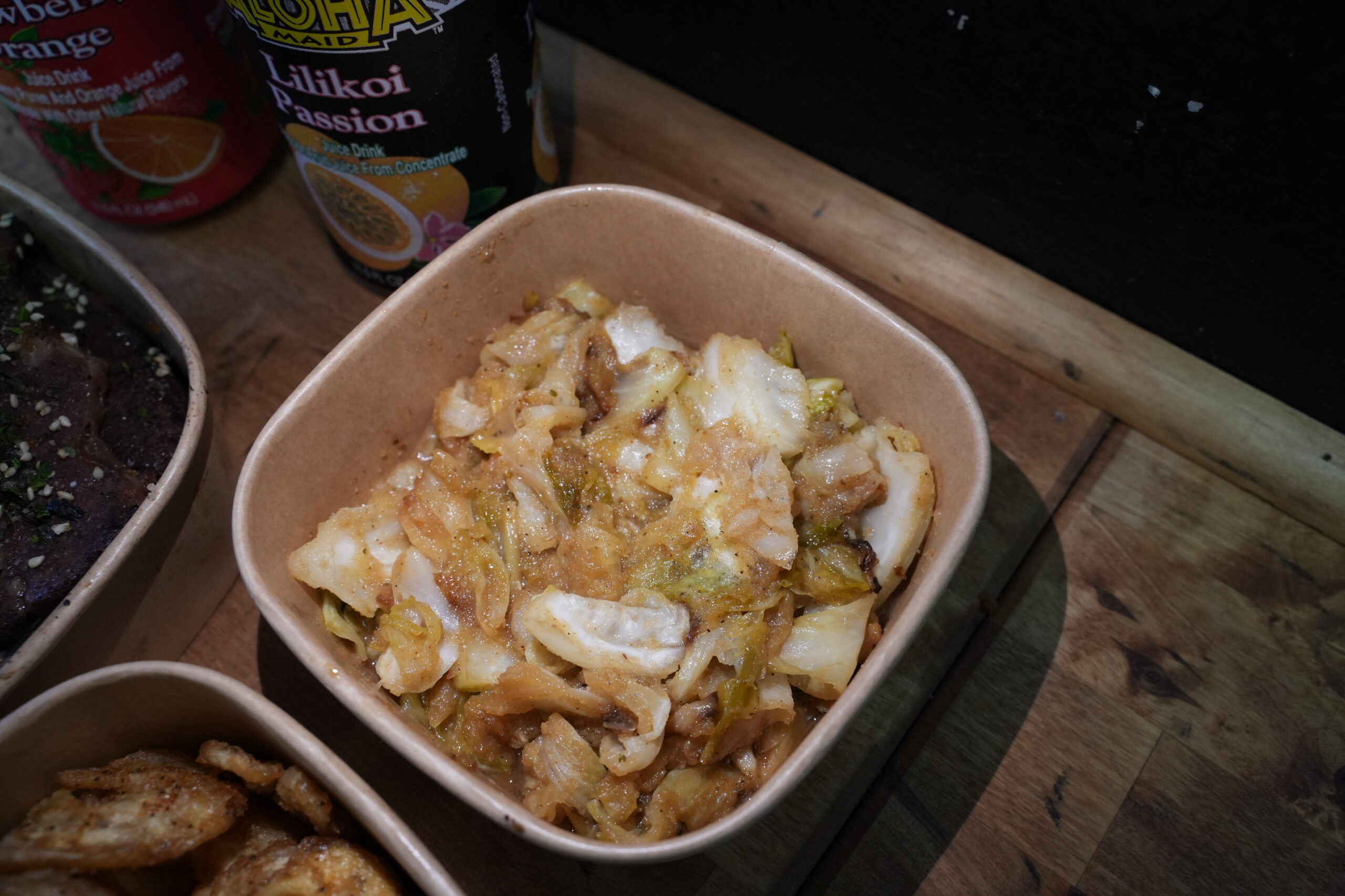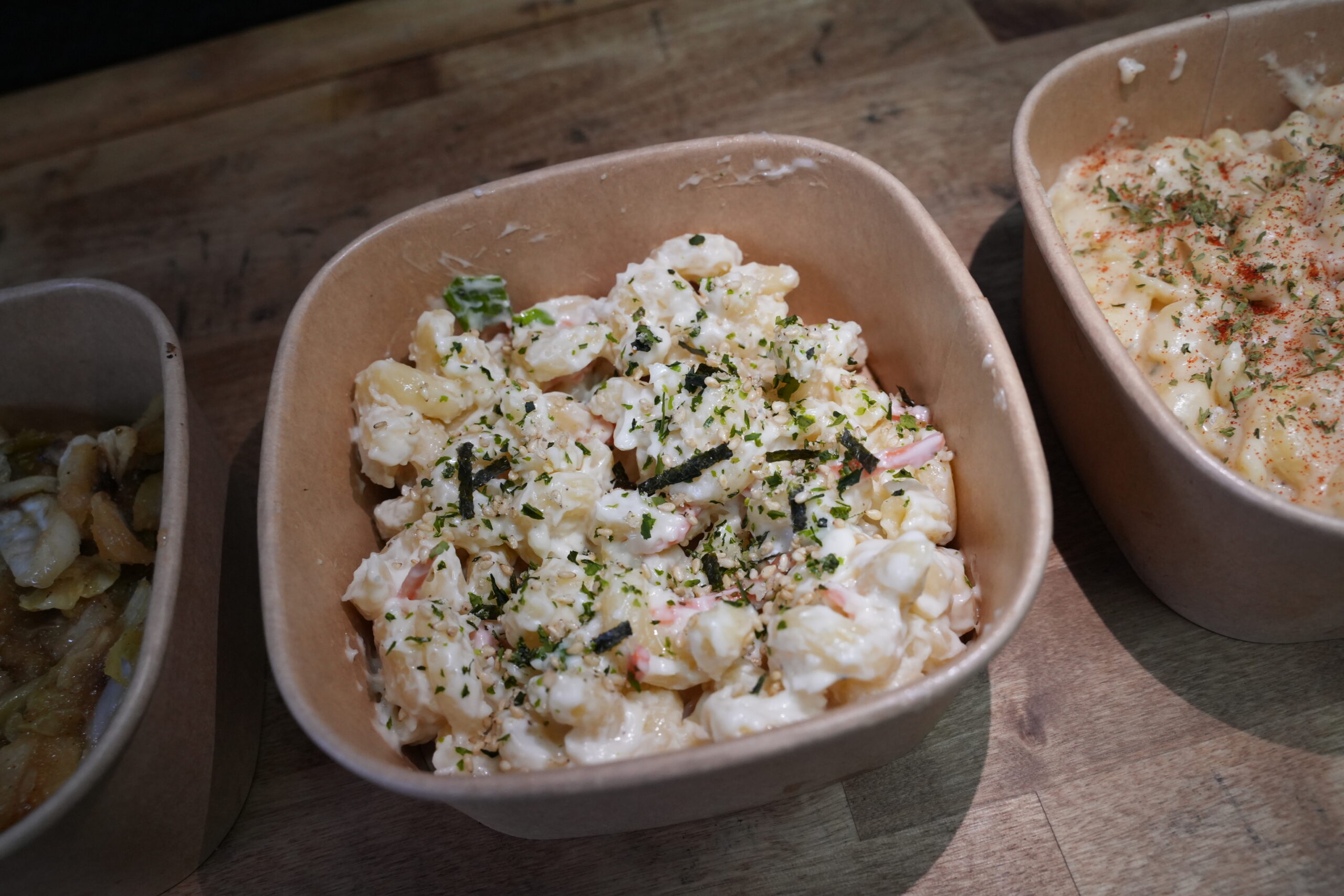 Our authentic Hawaiian mac salad is a comforting creamy classic. We use perfectly cooked elbow macaroni tossed in a thick, tangy, and rich house made mayo, with just a hint of shredded carrots and sweet onions.