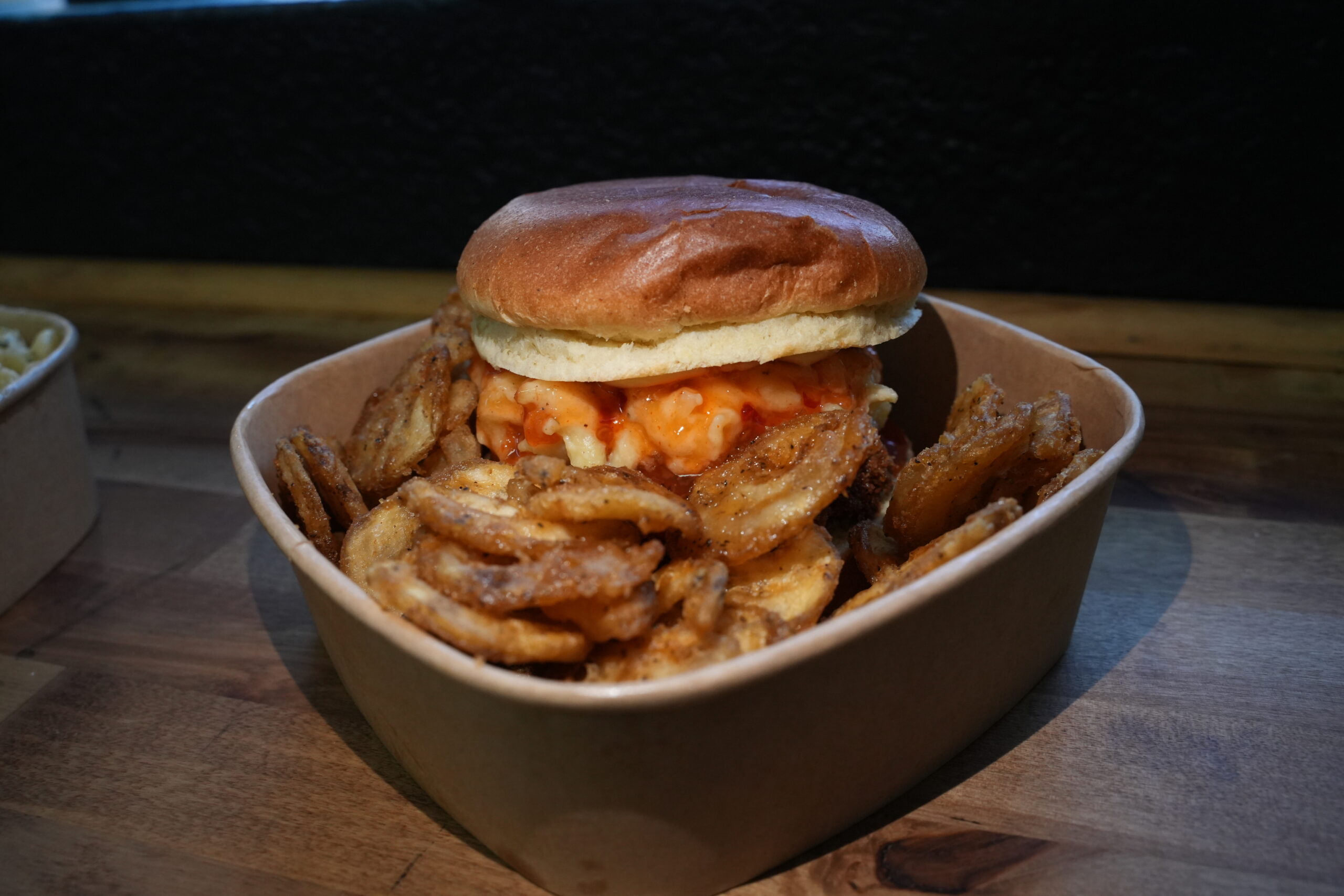 Gold breaded Katsu-Delight topped with our cajun mac and cheese and tossed in our spicy blends. Covered in our signature Wavez red chili sauce and served on a brioche bun with cajun fries.